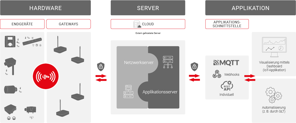 Long Range Wide Area Network – kurz LoRaWAN®* – ist eine Funktechnologie, die in der Lage ist, Daten über eine grosse Entfernung und auch von abgelegenen und schwer zugänglichen Orten energieeffizient, kostengünstig und sicher zu übertragen. Das LoRaWAN® Produktportfolio von Thermokon bietet die Möglichkeit, flexibel zwischen batterieversorgten und kabelgebundenen Sensoren mit analogen Signalausgängen und LoRaWAN®-Option zu wählen. Im Batteriebetrieb sorgt die hohe Energieeffizienz der Sensoren für einen extrem wartungsarmen Betrieb über viele Jahre hinweg.