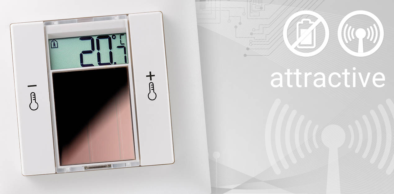 Energieautarkes Design-Raumbediengerät zur integrierten Messung der Temperatur und relativen Feuchte (rH-Ausführung). Je nach Ausführung und Typ können Temperatur-Sollwert, Lüfterstufen, Raumbelegung, Beleuchtung oder Jalousie über die Tasten am Gerät verstellt oder geschaltet werden. Das Gerät sendet seine Messwerte an entsprechende Empfänger oder Gateways, die die Informationen direkt weiterverarbeiten oder – je nach Anwendung – an eine zentrale Regeleinheit weiterleiten. über das SmartACKNOWLEDGE Protokoll kann dem bidirektional arbeitenden Funk-Raumbediengerät Sollwert, Lüfterstufe und Raumbelegung von extern überschrieben und im integrierten Display dargestellt werden. Die Parametrierung des Raumbediengerätes erfolgt via Funk über die Software airConfig oder alternativ über das optional erhältliche USB-Programmierinterface. Über die USB-Schnittstelle kann der Energiespeicher zusätzlich geladen werden. Das über Klebepad oder Schrauben zu montierende Gerät kann in nahezu alle 55x55 mm-Schalterprogramme integriert werden. Dadurch kann aus vielen hochwertigen Designs gewählt werden.