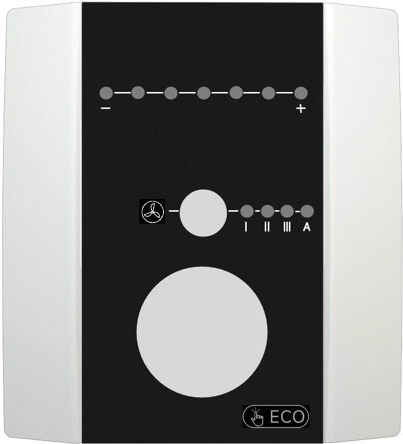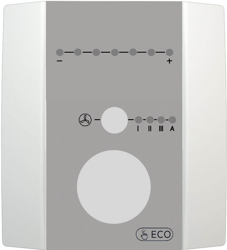 ePaper Display 44x24 mm, LED zur Statusrückmeldung, 7 LEDs zur Anzeige der Sollwertverstellung, Beschriftung {- +}, 4 LEDs zur Anzeige der Lüfterstufe, Beschriftung {[Lüfterflügel] I II III A} |