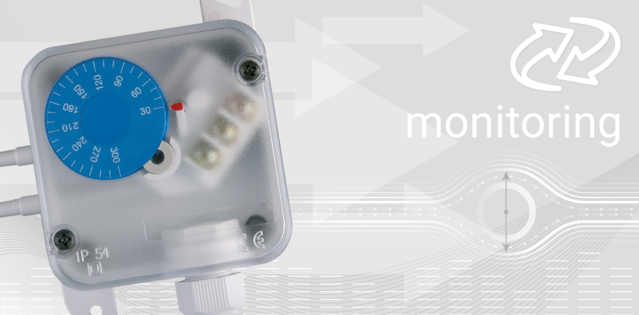 Einstellbarer Differenzdruckschalter mit Montagezubehör für Luft und andere nicht brennbare und nicht aggressive Gase zur überwachung von z.B. Filter, Gebläsen, Luftklappen, Keilriemen und Strömungen in der Lüftungstechnik.