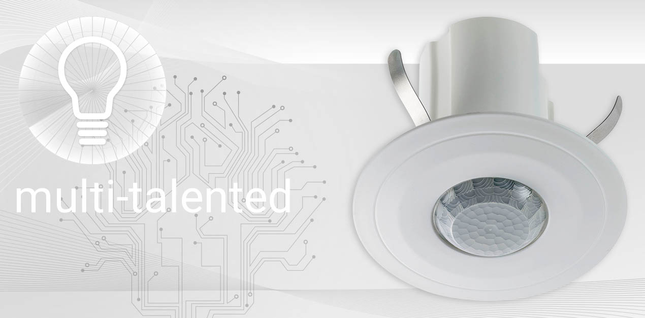 Ceiling-mounted multi-sensor for detection of light and motion in rooms and office spaces. Energy-efficiency can be optimized through connecting the MDS to an automated constant light control and temperature reduction in unoccupied rooms. The flat design makes up for an inconspicuous installation in e.g. suspended ceilings. For mounting on concrete ceilings, a surface-mounted frame is available.