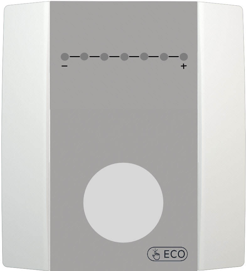 Pantalla ePaper 44x24 mm, LED para retroalimentación del estado, 7 LED para visualizar el ajuste del punto de ajuste, etiquetar {- +}, 4 LEDs para mostrar el etapa del ventilador, etiquetar {[pala de abanico] I II III A} |
