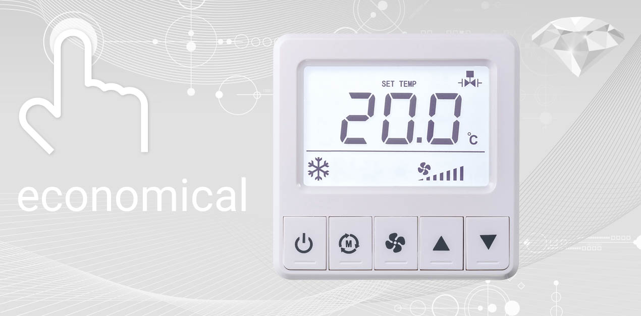 réglage de consigne température, +16..+30 °C (paramètres par défaut), configurable en option, réglage de l'étapes de ventilateur, plusieurs affichages de statut |