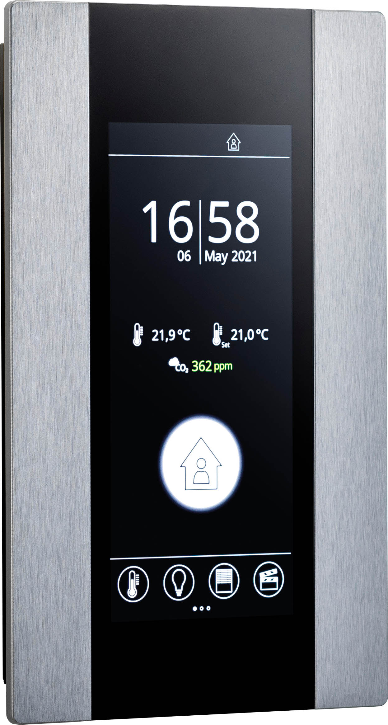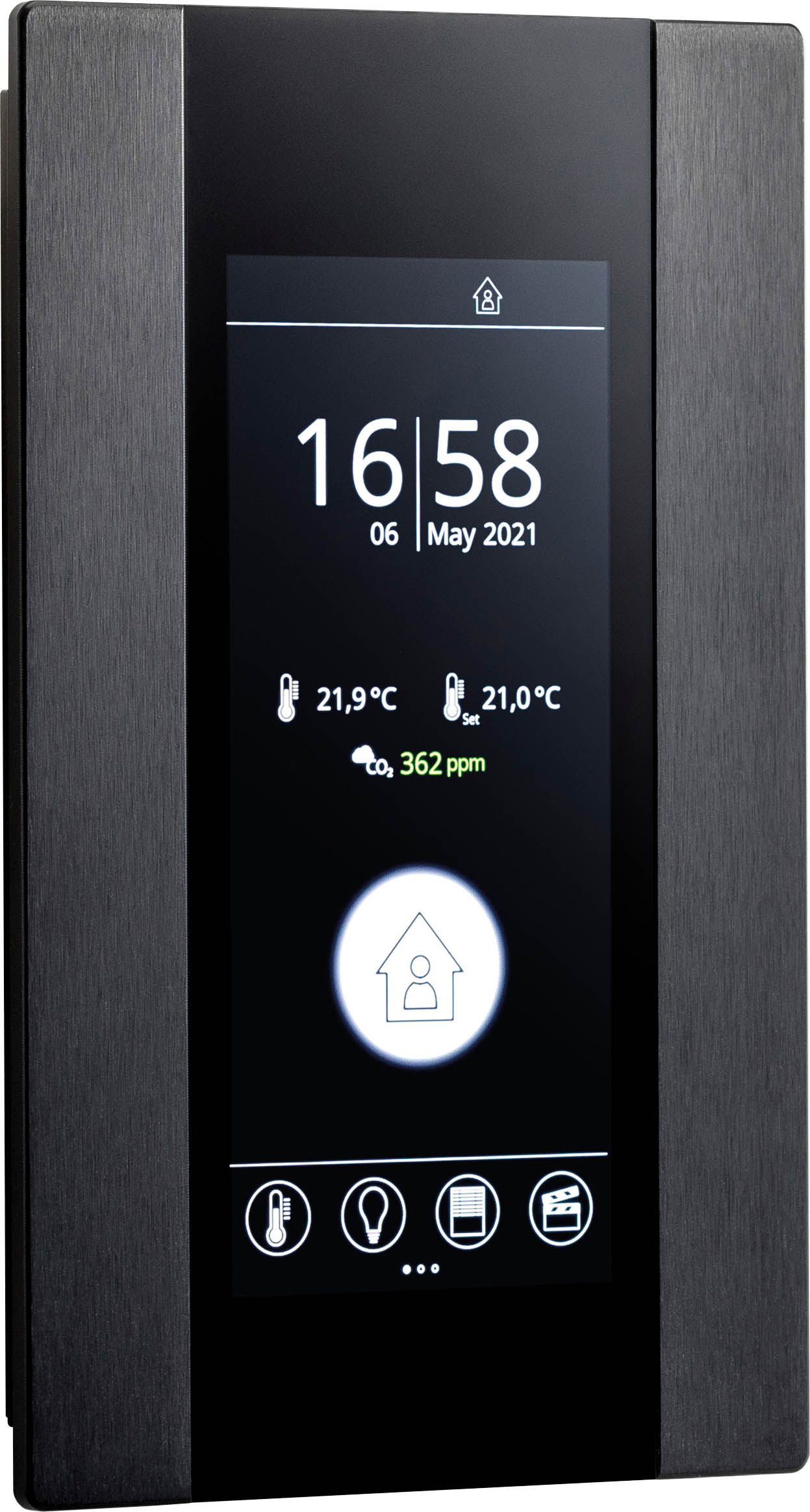 Grazie a caratteristiche innovative, il cui Modulo operatore ambiente in un'unica unità di controllo della sala è unico nel suo genere, il controllo della sala con thanos EVO è semplice, autoesplicativo e adatto a tutte le esigenze. Oltre alla temperatura e all'umidità, vengono misurati anche i due parametri di qualità dell'aria CO2 e VOC; i valori del sensore esterno possono essere visualizzati tramite l'interfaccia BUS. La facilità d'uso è supportata anche dalla visualizzazione di brevi messaggi di testo e dall'uso di grafici di sala in 2D, che, ad esempio, rendono conveniente l'accensione e lo spegnimento delle luci per il cambio di gruppo di utenti. Altre caratteristiche includono una funzione ECO e un comodo comando cieco.