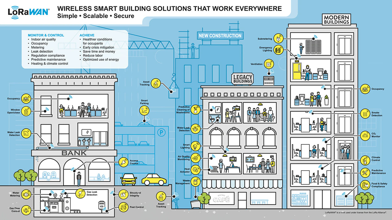 Les réseaux LoRaWAN coexistent facilement avec d'autres réseaux sans fil, car ils sont complémentaires du Wi-Fi, au Bluetooth, à la 5G et à la RFID, entre autres technologies, ce qui renforce encore leur adéquation aux applications de bâtiments intelligents. Grâce à sa capacité à s'intégrer de manière transparente dans les normes des systèmes de gestion des bâtiments telles que BACnet, KNX, Modbus et autres environnements similaires, LoRaWAN permet de moderniser et de mettre à niveau rapidement les installations anciennes tout en conservant la valeur des systèmes de gestion des bâtiments existants. Les avantages sont tout aussi importants pour les nouvelles constructions, grâce à une large gamme de capteurs certifiés permettant de mieux gérer l'environnement des bâtiments, la consommation d'énergie, l'utilisation, etc.