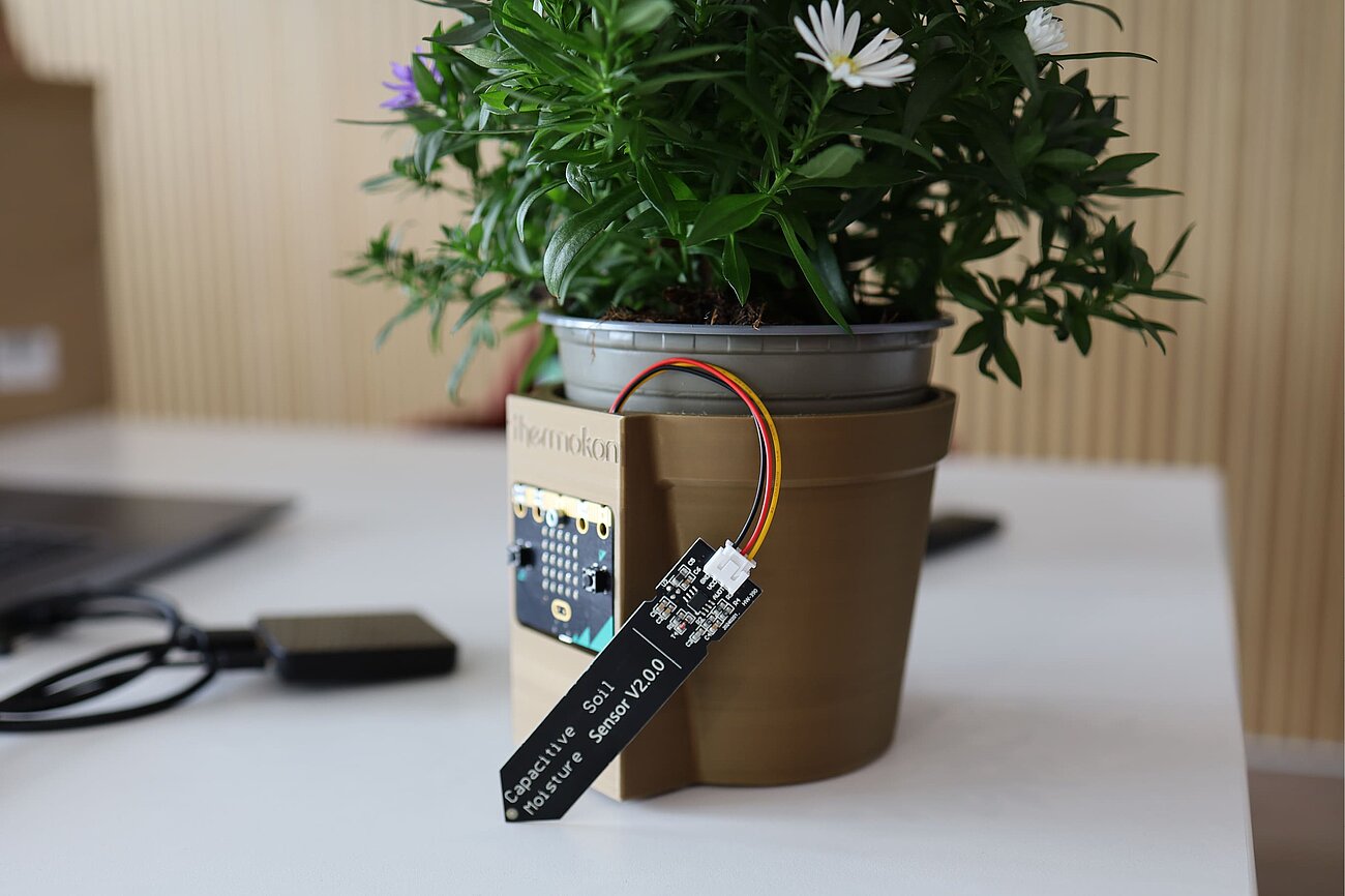 In diesem Jahr stand ein smarter Blumentopf mit Feuchtesensor auf dem Plan. Das Gehäuse entstand im 3D-Druck nach einem Modell, das ein Kollege eigens konstruiert und so ins Projekt eingebracht hat. Unter Anleitung unseres Ausbilder:innen-Teams übernahmen die neuen Nachwuchskräfte das Löten der Sensor-Platine, die Programmierung des Micro:Bit und die Funktionsprüfung der LED-Matrix-Anzeige.